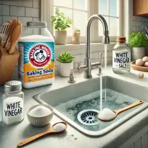 - Mode d’emploi : Versez une demi-tasse de bicarbonate de soude dans la canalisation, puis ajoutez une demi-tasse de vinaigre blanc. Laissez agir pendant 30 minutes, puis rincez à l’eau chaude.